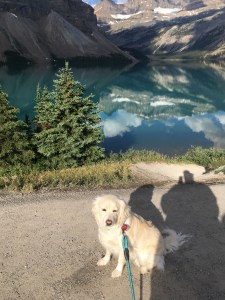 Our first stop was at Bow Lake, which is fed by Bow Glacier – the source of Calgary’s drinking water. Everything was new to Lacey so I allowed her to explore as much as possible; she took full advantage of the time to smell everything and deal with all the strangers, loud buses, trucks, cars, camper-vans milling around us, and process her first experience with a mountain environment filled with strange new scents and sights.