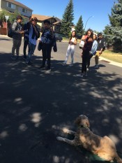 Distraction work came in the form of vehicles and high school kids walking past. Glimmer is a very social dog with a strong leaning towards young people, so it was very challenging for her to maintain her position on her mat while the high school kids walked past. A large group of them even helped with the exercise by standing nearby. It was all Glimmer could do to hold her position instead of bolting towards them – which she very clearly wanted to do. 😀