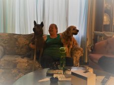 For the first half hour of the meeting, Lupin was muzzled. Near the end of that time, he was doing so well and being so respectful that I removed the muzzle and let him wander through the house. I wanted him to start using his nose to familiarize himself with the surroundings. Devi was a bit nervous about that – she saw Lupin trying to interact with Violet, and she was concerned he would get too rough with her – but she trusted me to take him in hand if he gave any indications that he was getting too excited. As it turned out, Lupin was awesome with Violet.