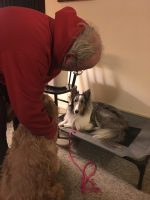The final session involved my husband. He helped by knocking on the door when he got home from work. Skylar immediately went to “place”, and except for a couple of cursory barks to alert me that someone was at the door, she did a fantastic job of remaining quiet and waiting for direction. And when I returned home later in the evening after seeing a client, I knocked on the door and he handled Skylar. She barked a couple of times, and then she was quiet; when I opened the door, she was in “place” on the cot and waiting for my husband to give her direction.