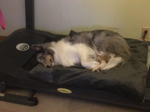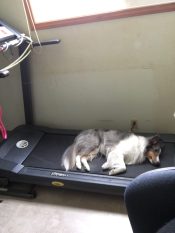 To my surprise, Skylar took to the treadmill like a duck takes to water. Even more surprising was that she enjoyed it so much that even when she was finally too pooped to pop, flopped out on the tread after the machine was turned off. The machine became her new best friend. 😀