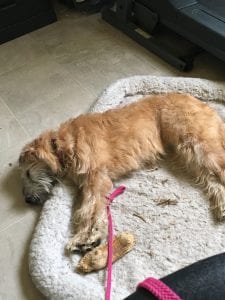 Amber had a very full afternoon and evening. She had two car rides, and her very first visit to one of our local pet stores. She squirmed around quite a bit on the drive there, but she was calm and quiet on the way home. Inside the store, she was immediately bombarded with a ton of new sights, sounds, and scents. She was nervous, but her inherent curiosity took over and she started smelling everything she could get her nose to. She even met a couple of the staff – calmly, politely, and without trying to jump on them, as Wheatens are prone to do.