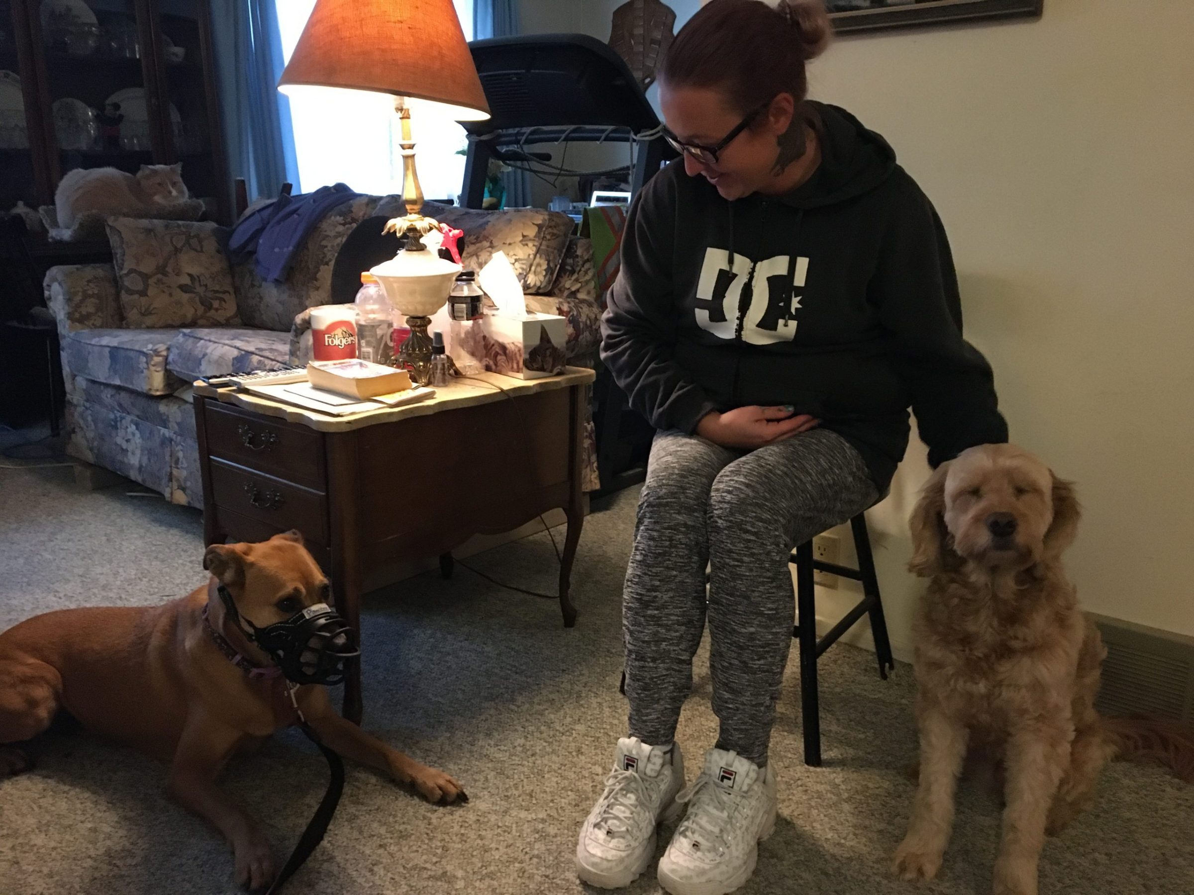 Because she is reactive to strangers, Stella will be muzzled again when my husband is on his way home. She and he have not met each other yet, so the muzzle is a necessity for his safety. It is my hope that being in a calm and relaxed environment most of the day will help her feel more relaxed about him coming in. We will find out in a couple of hours.