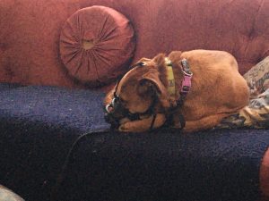 Stella has had a very good day today. Earlier, she earned several hours of free time in the living room with Glimmer and Violet. Now, for the past couple of hours, she has been there with them and my husband… and without needing to be muzzled. She has really taken to my husband…