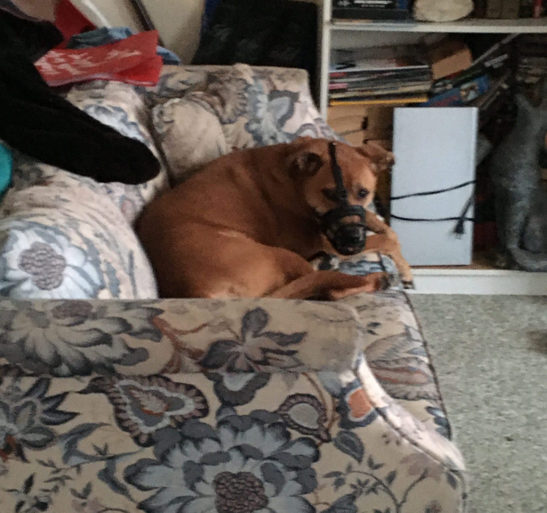 The weather became decent enough today that I could get her out for a short walk so I could start exposing her to strangers. There were several people outside, and Stella did a fantastic job of watching but not trying to lunge or bark. However, she was muzzled, and the muzzle tends to subdue her quite a bit. But it also allows me to help her learn a different way of perceiving the world. So, for at least the next couple of days, I will continue to muzzle her when I take her out.