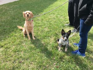 Little Solo – a 2-months-old Border Collie/Blue Heeler mix – is a rambunctious little firecracker with loads of energy, very high intelligence, and tons of personality. Today, his owner, Courtnay, and her dad met up with Glimmer and me so he could start learning how to be polite around other dogs. Glimmer did a great job of using her body language to teach Solo what energy level and body language is and is not acceptable.