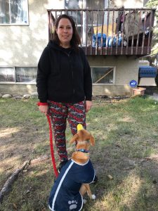 Chanty was much less reactive towards me when I arrived for his second session. He did lunge and bark at me when I was moving into position for the pass-by exercises, but after a quick correction from Becky, he chose avoidance. For safety, he was muzzled for the duration of the exercise.