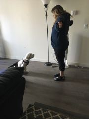Lola has had two lessons so far. The first lesson was focused on teaching her to connect and engage with Tracey through eye contact. This was extremely difficult for Lola; she was so nervous that even slight movement from me sent her into a tizzy of barking, growling, and mock-charging. Lola is a Covid puppy; because of all the restrictions that were in place, she didn’t receive the socialization to people and other animals that she needed. I was the very first person to enter her home since she came to Tracey; she had no idea what to do. Unfortunately, Tracey didn’t know how to help Lola with that, so she did nothing.