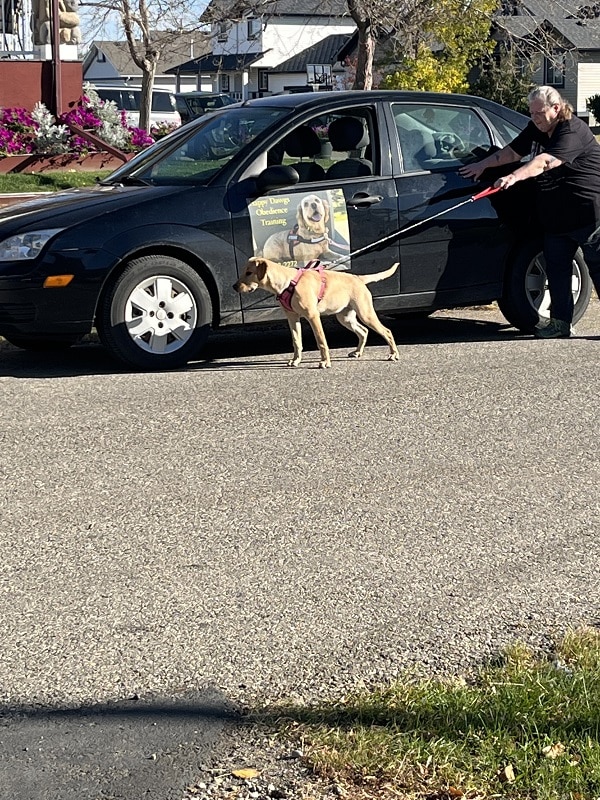 I gave Abby lots of time to sniff everywhere she could reach on the leash. She was doing really well… and then, she saw my husband. She immediately reacted by barking and growling at him and pulling hard on the leash. I saw her tail was tucked deep between her legs. I instructed him to be still, be quiet, and to avoid making eye contact with her, and I moved her away and then brought her back around to try again. The best I was able to achieve with her was to reduce the volume of her growling, ease up her lunging, and change her bark into hard, heavy huffs.