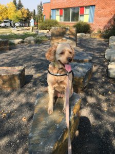 Some of the work I’ve done with Glimmer over the past few years has been a form of dog parkour. I can attest to the positive effects it has had on both her confidence, and her trust. While she doesn’t take parkour to the same level other dogs do [e.g. she doesn’t crawl under things yet], she’s learned how to climb onto and stay seated on irregular-shaped objects such as rocks and fallen tree limbs, she’s learning how to balance on narrow planks, and she’s learning how to go into a down position on fallen logs. When we finish a dog parkour session, her eyes sparkle with happiness and she has a huge grin on her face.