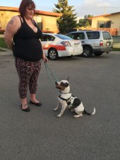 As we neared the end of the hour-long session, Gizmo was finally starting to show some self control. He was even able to go into a sit position and focus on me even though we were very close to what I am calling the “trigger house”. He was shaking and panting hard with the effort, but he did it. We practiced this a few times, and then I brought him back towards his owner to see how she was doing. She was still feeling a bit anxious, but she was ready to try taking over the leash. I stayed with her while she took Gizmo past the house and worked to redirect his attention. We did this a couple of times to help build her confidence, and then I stood back and let her go on her own with him. She did a fantastic job of keeping Gizmo focused on her, correcting at the right moments, redirecting when she needed to, and rewarding at the right time.